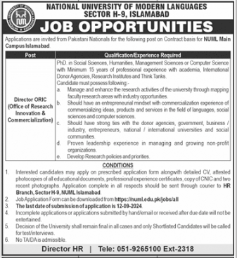 National University of Modern Languages Jobs: The National University of Modern Languages (NUML) for the position of Director ORIC (Office of Research Innovation & Commercialization) at their Main Campus in Islamabad. Here is a summary of the opportunity: