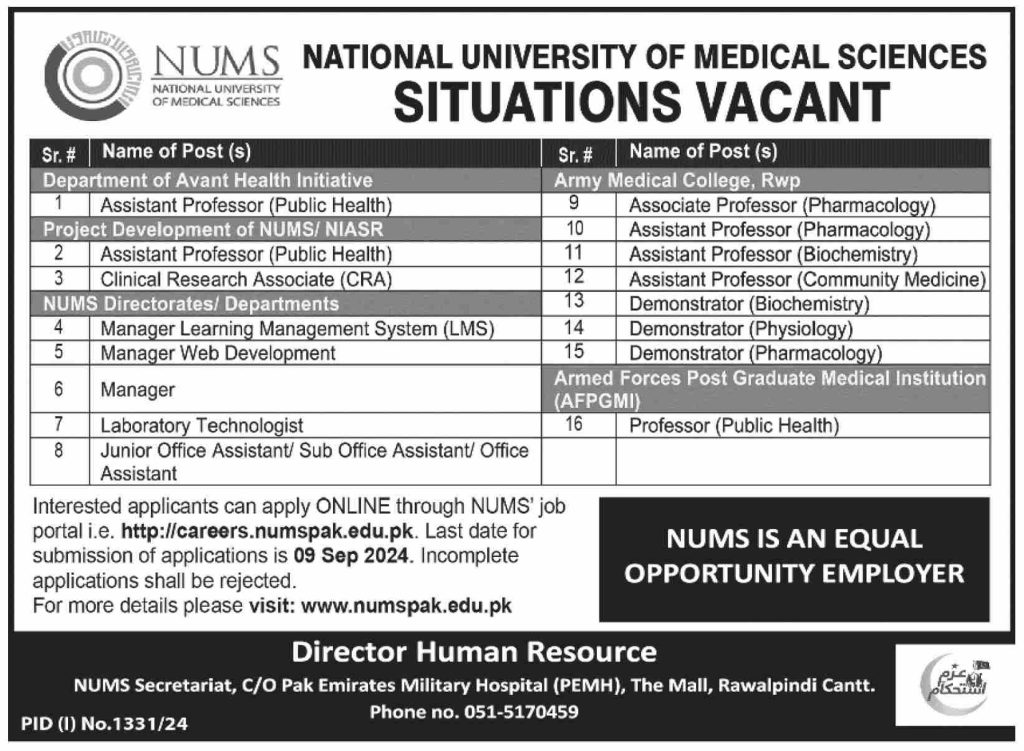 NUMS Job Opportunities: The National University of Medical Sciences (NUMS) invites applications for various positions across its departments. NUMS is dedicated to enhancing medical education and research in Pakistan and is looking for dynamic individuals to join its team. NUMS is an equal opportunity employer, committed to offering competitive career opportunities.