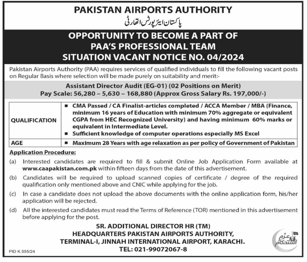 Pakistan Airports Authority PAA Job: The Pakistan Airports Authority (PAA) has announced a job opportunity through Situation Vacant Notice No. 04/2024, inviting applications from qualified individuals for the position of Assistant Director Audit (EG-01). Below are the key details: