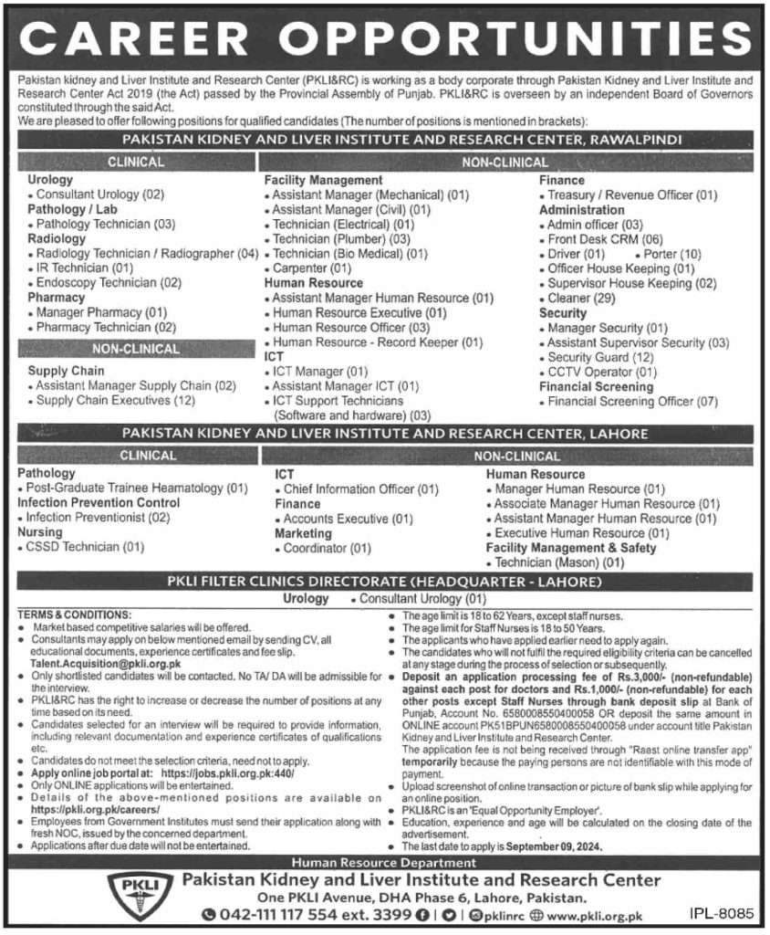 PKLI&RC has announced various clinical and non-clinical positions in Rawalpindi and Lahore. These include Consultant Urology, Pathology Technician, Assistant Manager (Mechanical, Civil, Supply Chain, ICT), Human Resource roles, ICT Managers, Financial Screening Officers, and more. Full details of available positions are listed on the PKLI Careers page. - How to apply?
