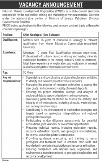 • Complete the application form available on the PMDC website and send it with supporting details (educational and experience letters) in an envelope marked “APPLICATION FOR Chief Geologist” on the top right corner, or email to career@pmdc.gov.pk.